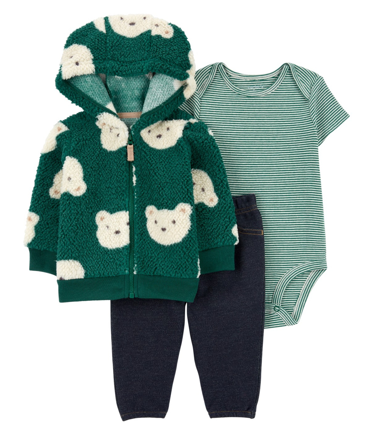 סט שלושה חלקים בעיצוב מתוק: קרדיגן פרוותי עם קפוצ'ון מחמם ועיצוב דובונים, בגד גוף קצר פסים ומכנס דמוי ג'ינס תואם - השילוב המושלם שיאפשר לכם לערבב ולהתאים את המראה המתאים בדיוק לקטנטנים שלכם.
