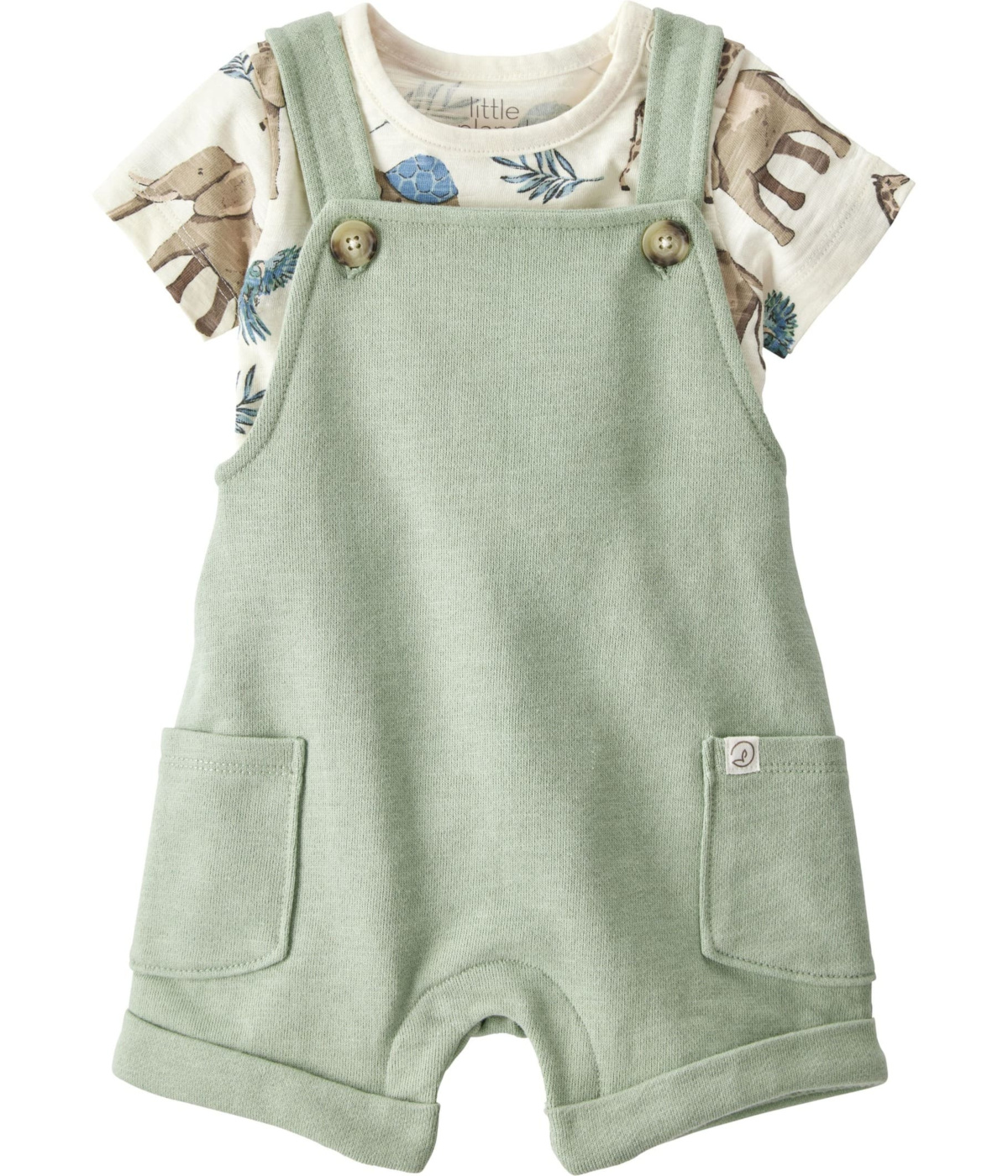 • _אורגני מוסמך לפי תקן GOTS (Global Organic Textile Standard)_סט 2 חלקים_חולצת טי קצרה בדפוס חיות_אוברול כתפיות עם כיסי צד_סגירת כפתרה קדמית_צבעים והדפסים בלעדיים_