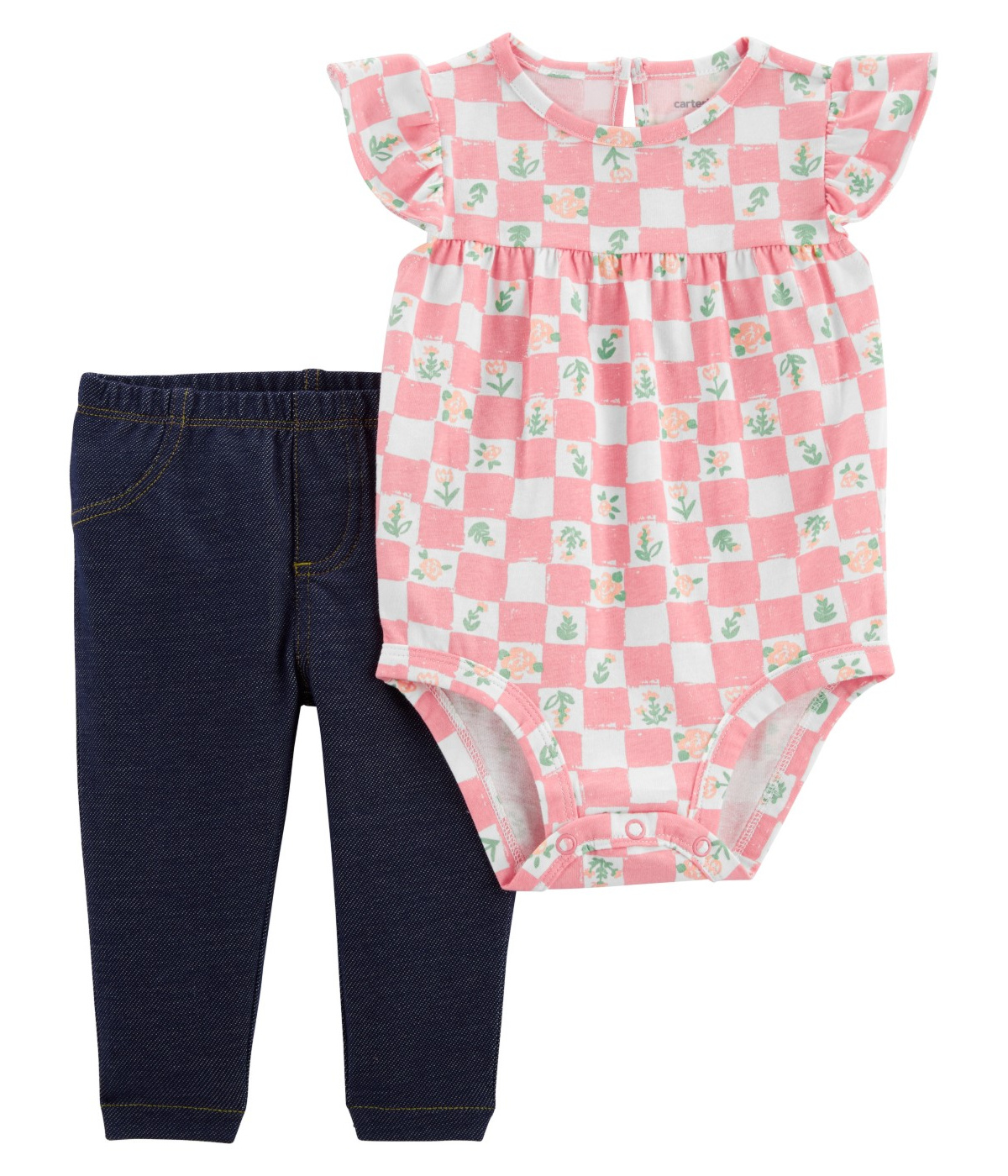 סט שני חלקים הכולל בגד גוף לתינוקות עם שרוולי כיווצים ודפוס משבצות ומכנסי טייץ דמוי ג'ינס - הלבוש המתוק והנוח ביותר בשבילה!